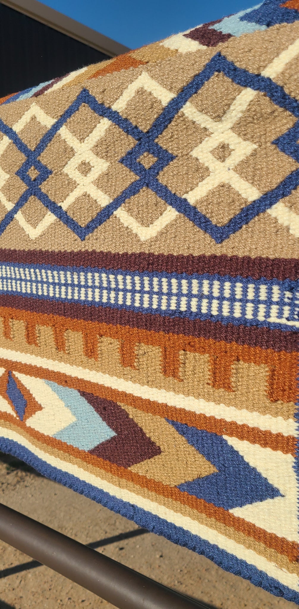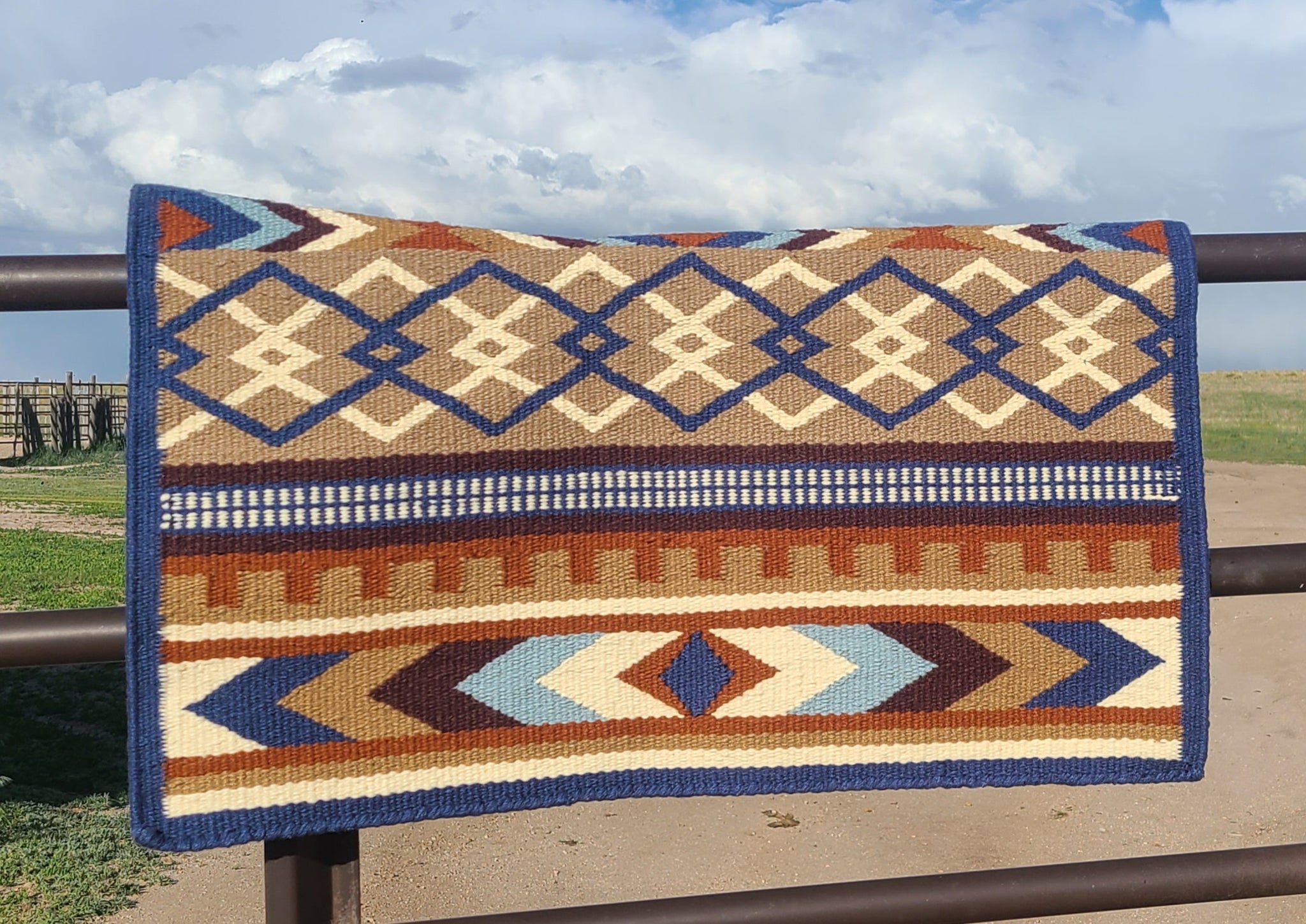 The Jackpot ELITE with a variety of slate blue, Indian tan, sand, rust, expresso, forget me not, and cream. This version is eye-catching, measuring approximately 34x40 contour on the highest quality available