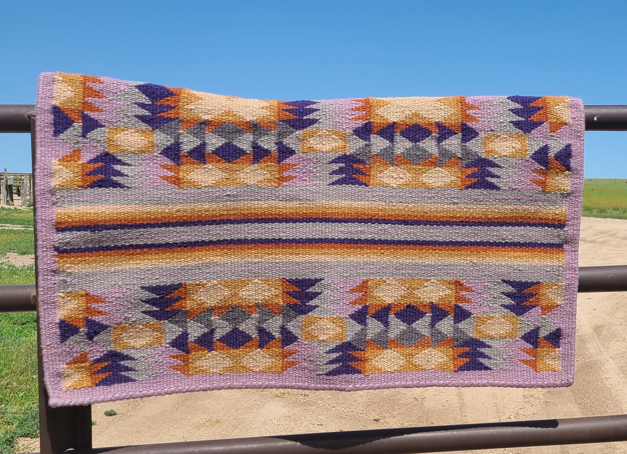 A slight color rearrangement of the Revelry ELITE with a lilac base, rust, indigo, sand and greys. This version is eye-catching, measuring approximately 34x40 contour on the highest quality available